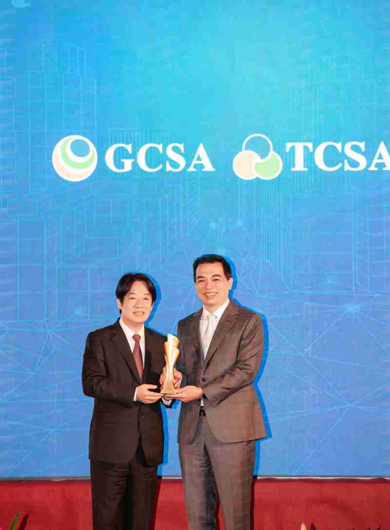 达全方位永续表现获全球永续奖及台湾永续奖肯定,,由副总统赖清德颁奖 (左),,,PA直营总经理柯富仁 (右) 代表领奖