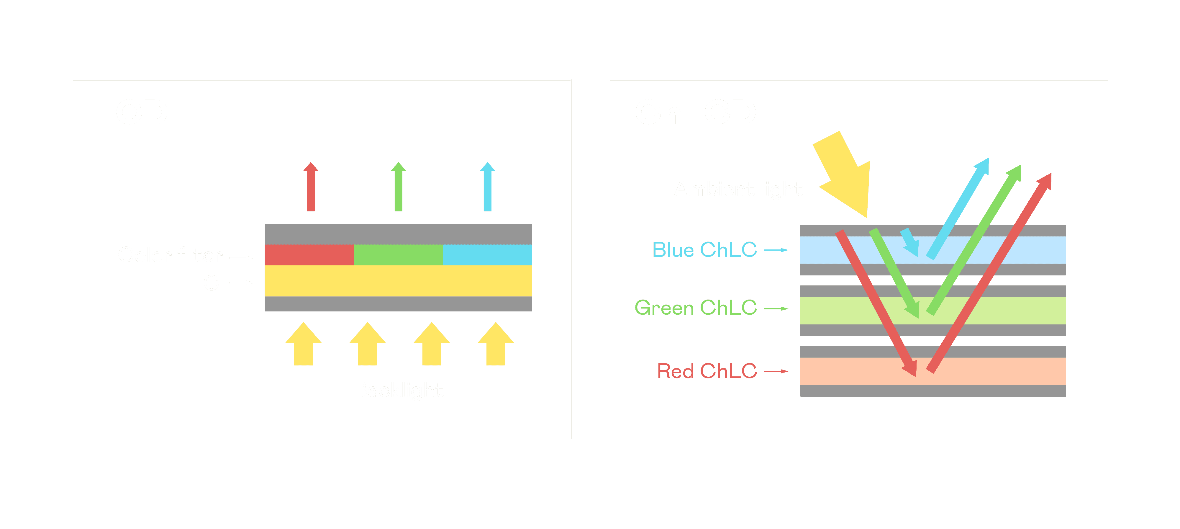 ChLCD 胆固醇液晶就如同纸张一样,,,,透过反射环境光来显示影像,,,因此长时间观看不易造成人眼视觉疲劳,,,可达到护眼效果。。。。当处于户外阳光下使用,,LCD 影像容易失真而不易观看,,,但胆固醇液晶仍可维持较佳的影像品质。。