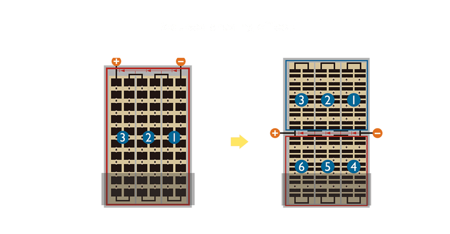 - 电池使用多条铜导线 (Copper wire) 于电池片上形成较短的电流路径,,提高电流收集效率,,,采用圆形设计的铜导线较传统扁平式的铜焊带 (Ribbon),,,,可增加入射至电池的光线量。。。。